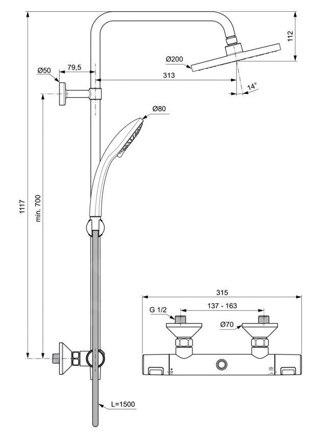 De hoofddouche heeft een diameter van 200 mm en een doorstroming van 12 l/min. Dankzij het ontwerp van de hoofddouche wordt het lichaam op aangename wijze omhuld door waterdruppels en biedt het een heerlijke ontspanning. Bovendien kan de hoek van de douchestraal dankzij het kogelgewricht gemakkelijk worden aangepast. De handdouche beschikt over een doorstroming van 8 l/min en een kopdiameter van 80 mm. Het is ideaal voor een regelmatige reiniging. Ook de antikalkfunctie, die de levensduur aanzienlijk verlengt en de prestaties op lange termijn perfect houdt, zal een pluspunt zijn. Verder bevat de handdouche een 1.500 mm lange doucheslang. Je kunt de handdouche ook in een glijstuk plaatsen en genieten van bijvoorbeeld een verfrissende rugmassage.