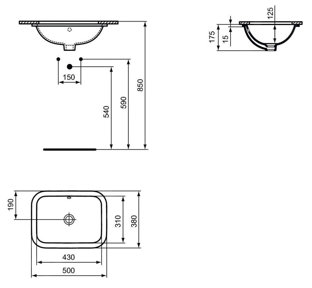 Rechthoekige wastafel voor inbouw onder plaat
