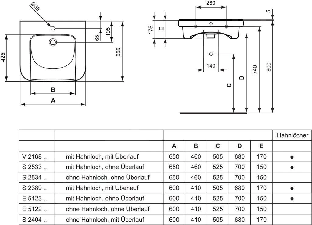 Ideal Standard Connect – Inbouwwastafel, 620×410 Mm, Met Overloop, Ideal Plus, Wit E5049MA