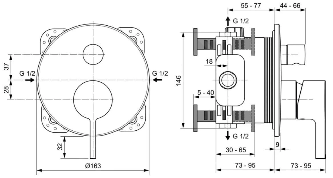 - cartouche Ø 47 mm met keramische schijven, met heetwaterbegrenzer